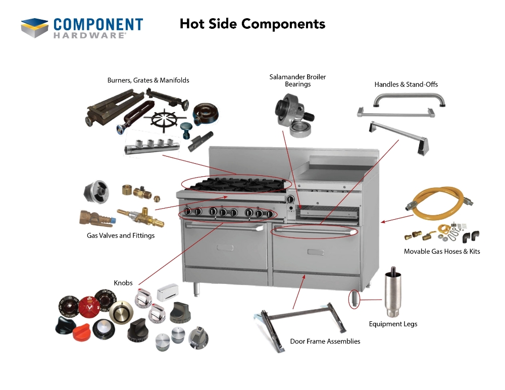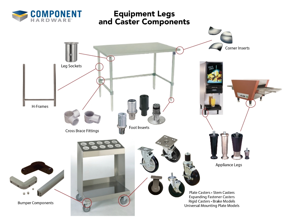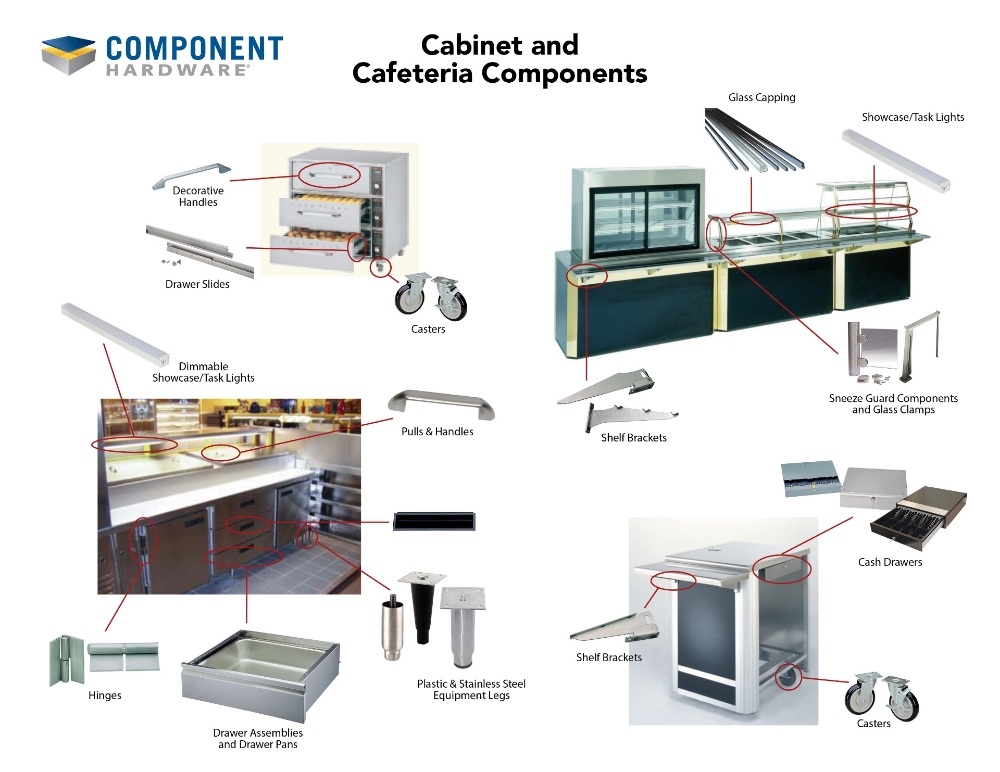 Cabinet Hardware, Cafeteria Components, Casters, Equipment Legs, Lighting and Electrical Components, Fabrication Supplies and Hot Side Components