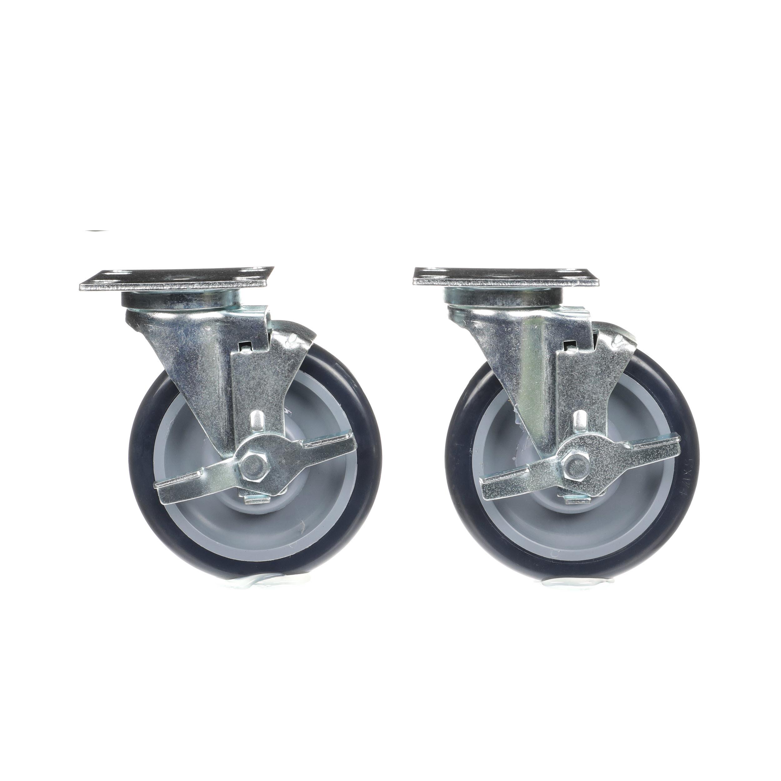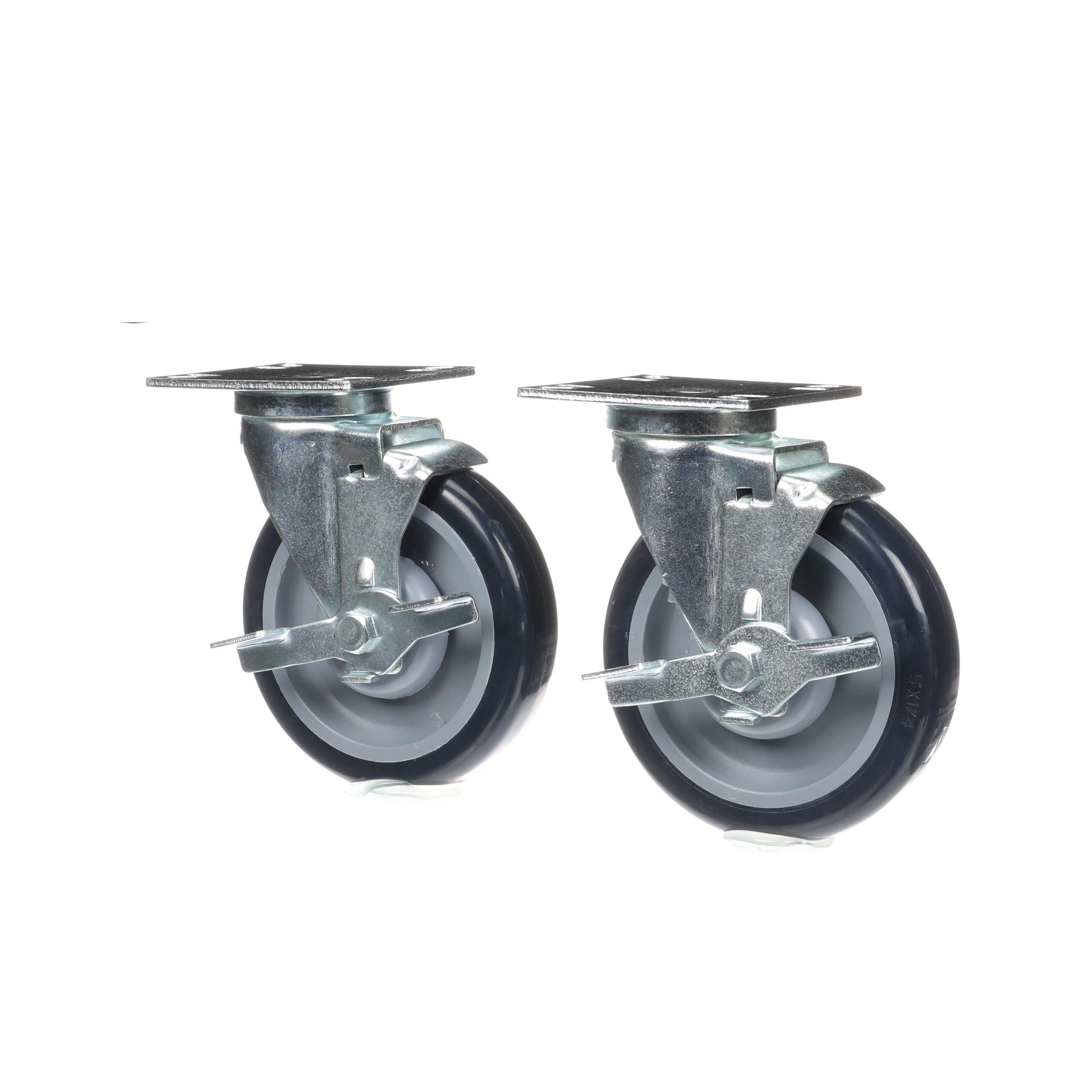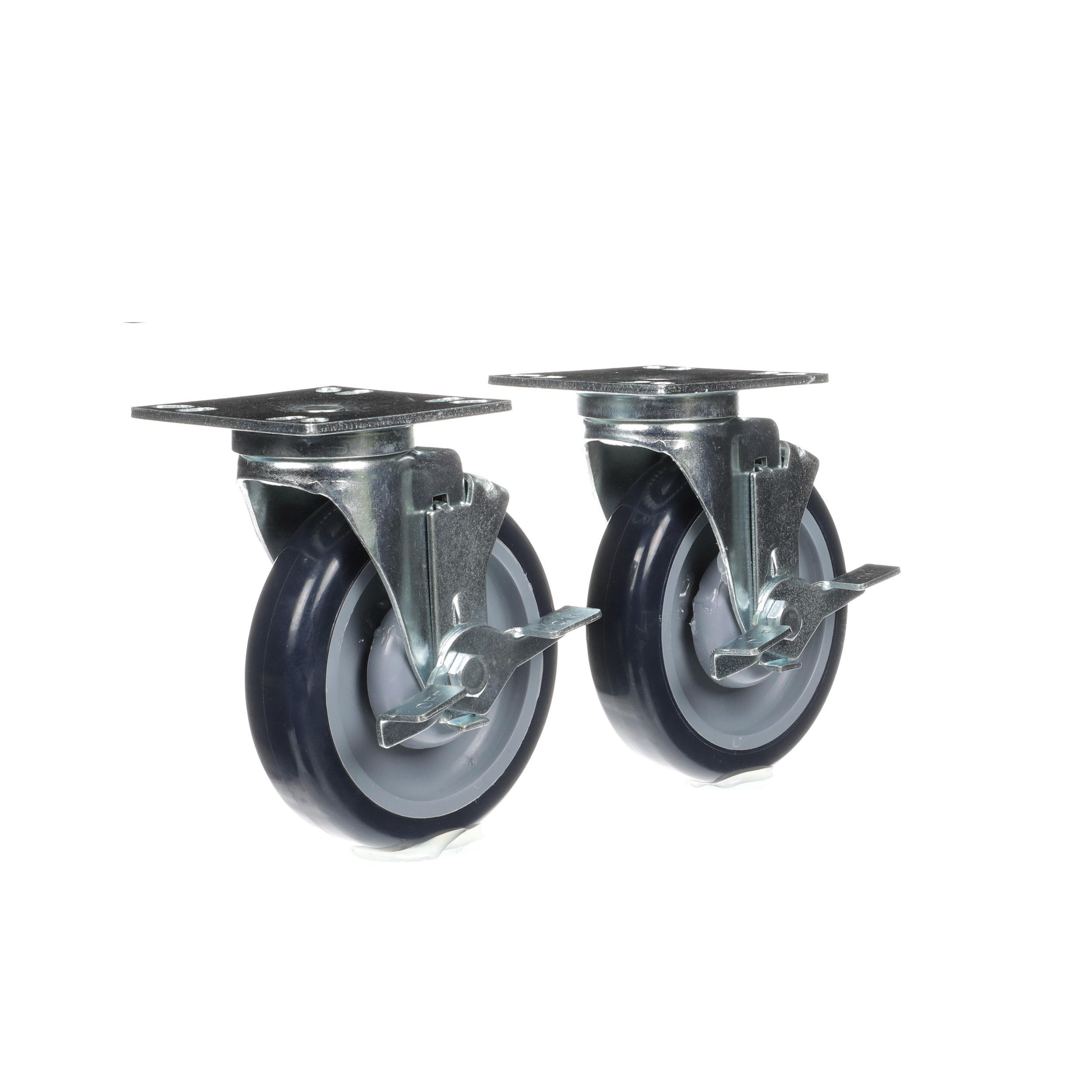- Caster Kit, Medium Duty 3-1/2" x 3-1/2" Universal Plate Caster With 5" Blue Polyurethane Wheel, 4 Brake In Retail Box
