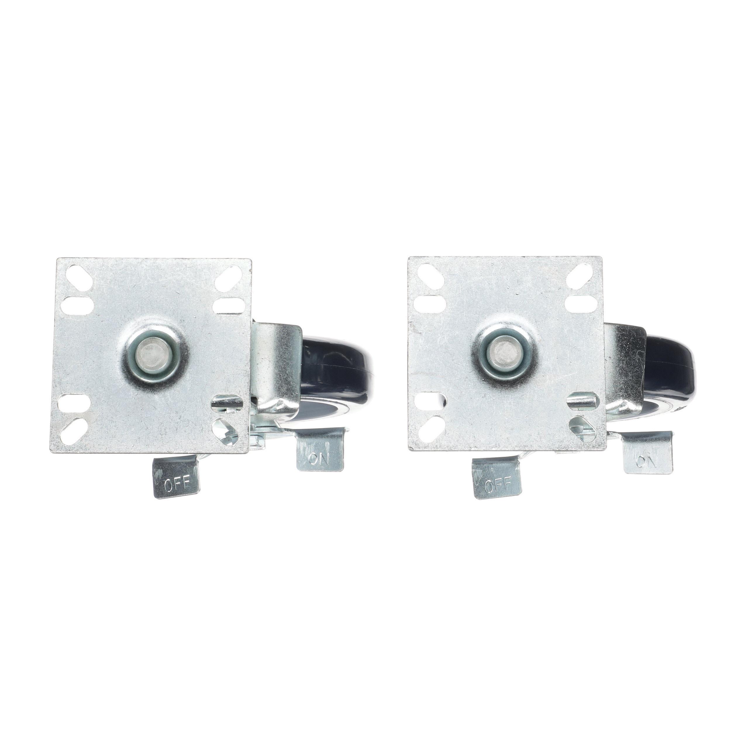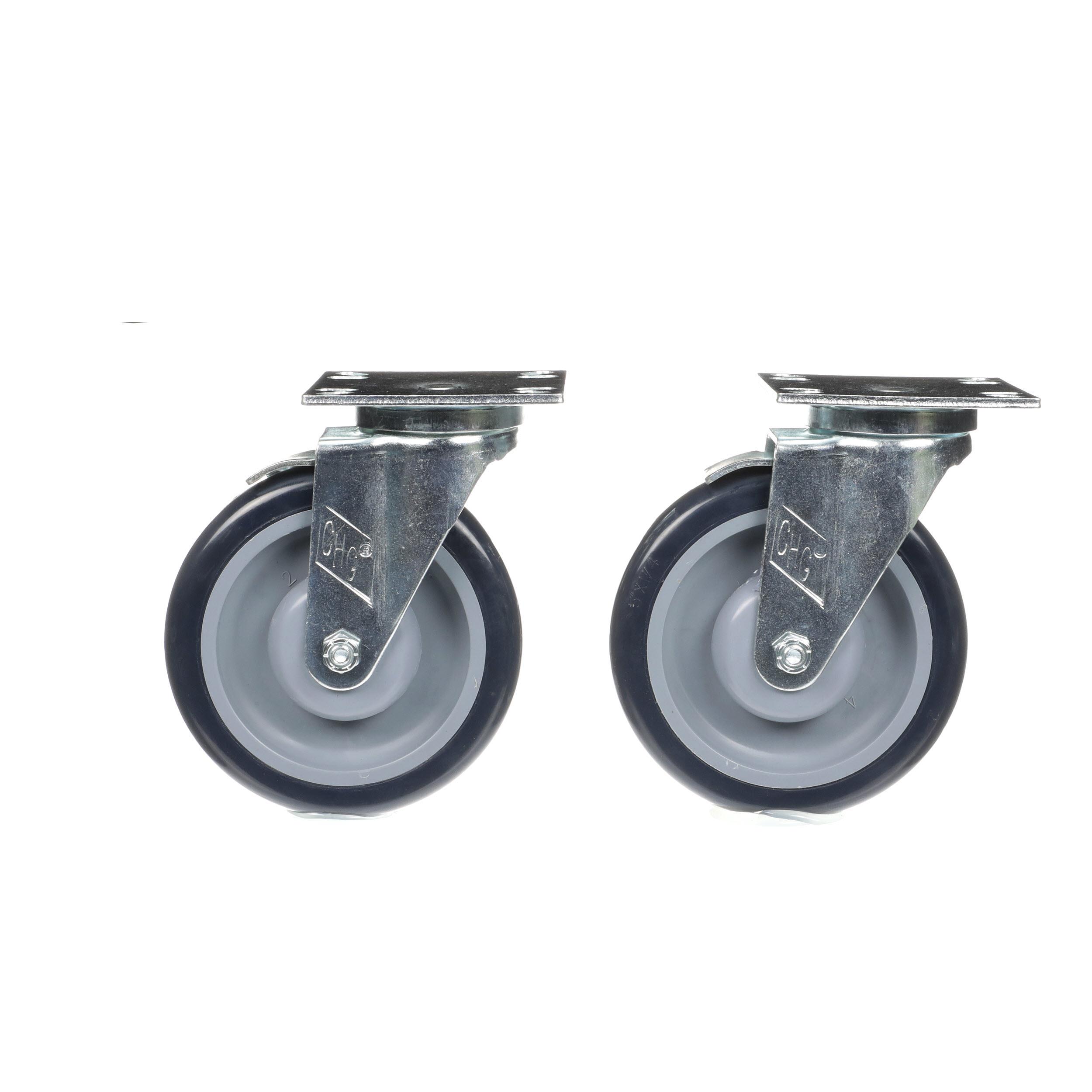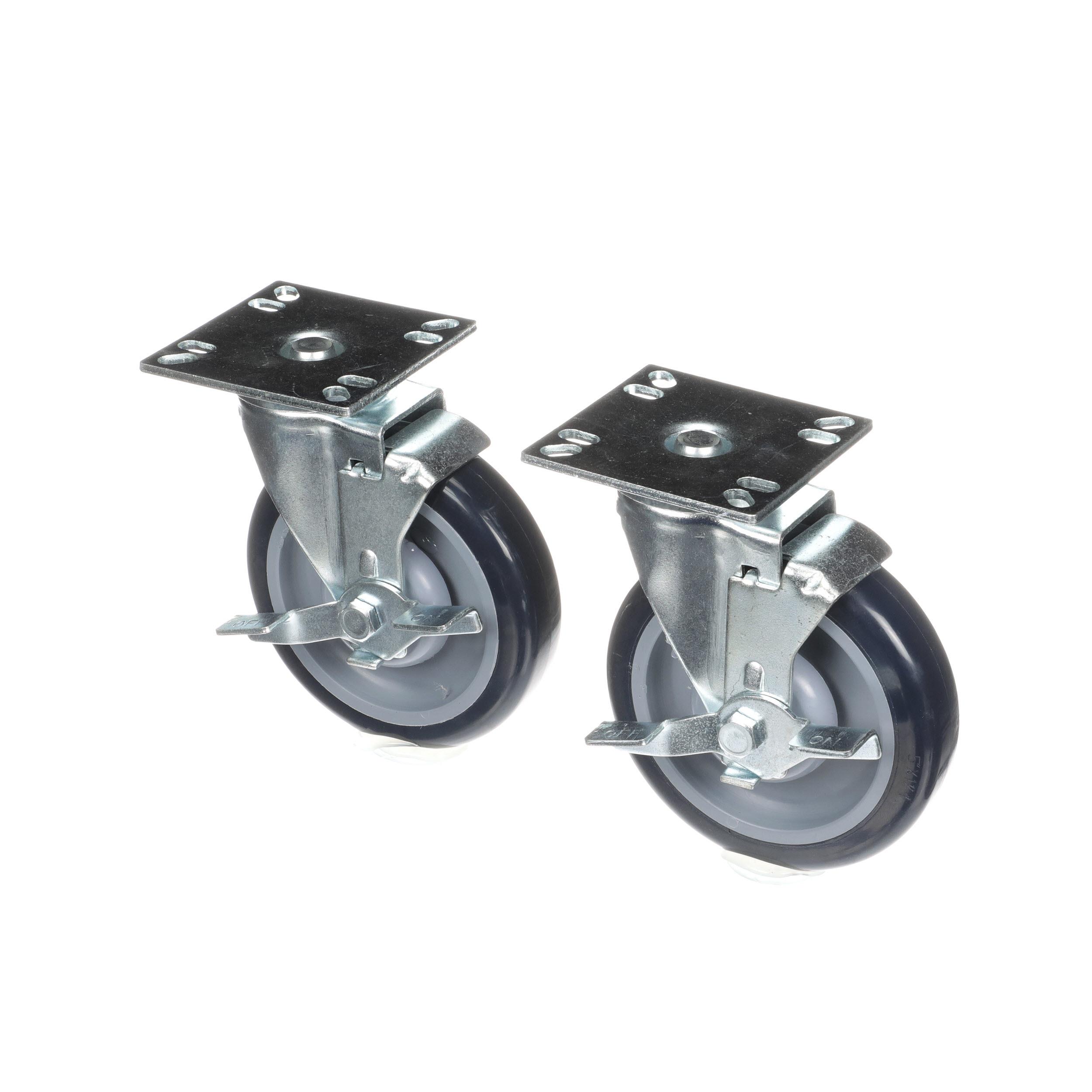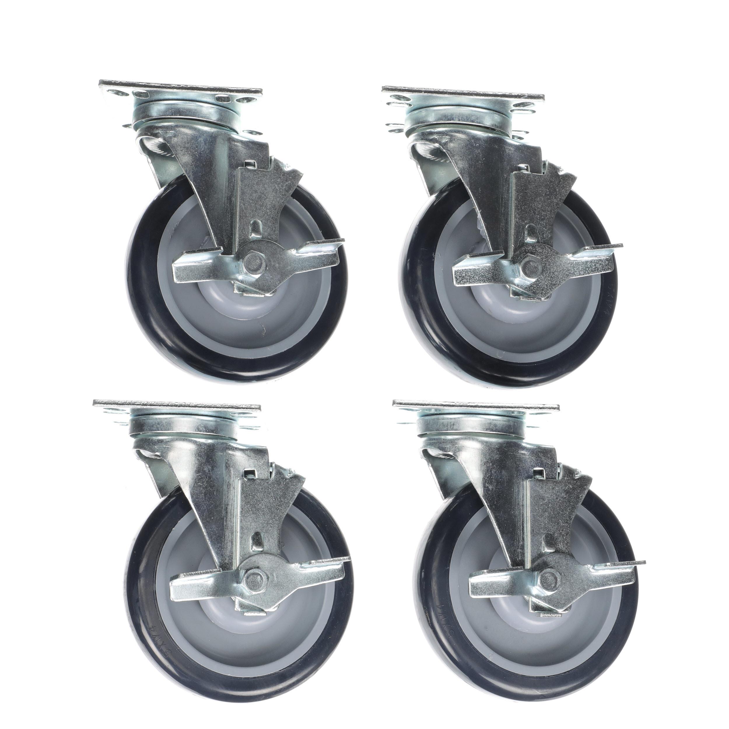 - Caster Kit, Medium Duty 3-1/2" x 3-1/2" Universal Plate Caster With 5" Blue Polyurethane Wheel, 4 Brake In Retail Box