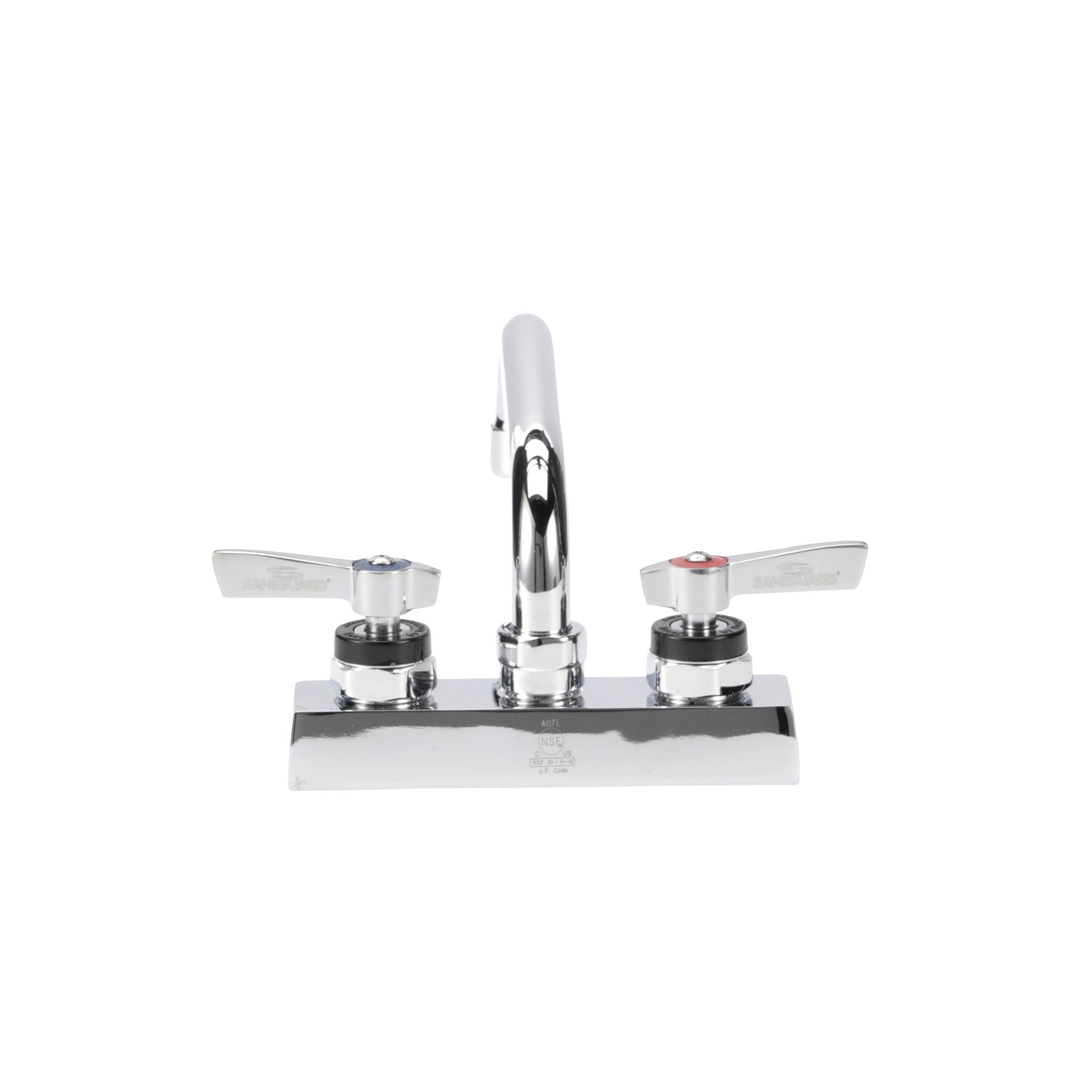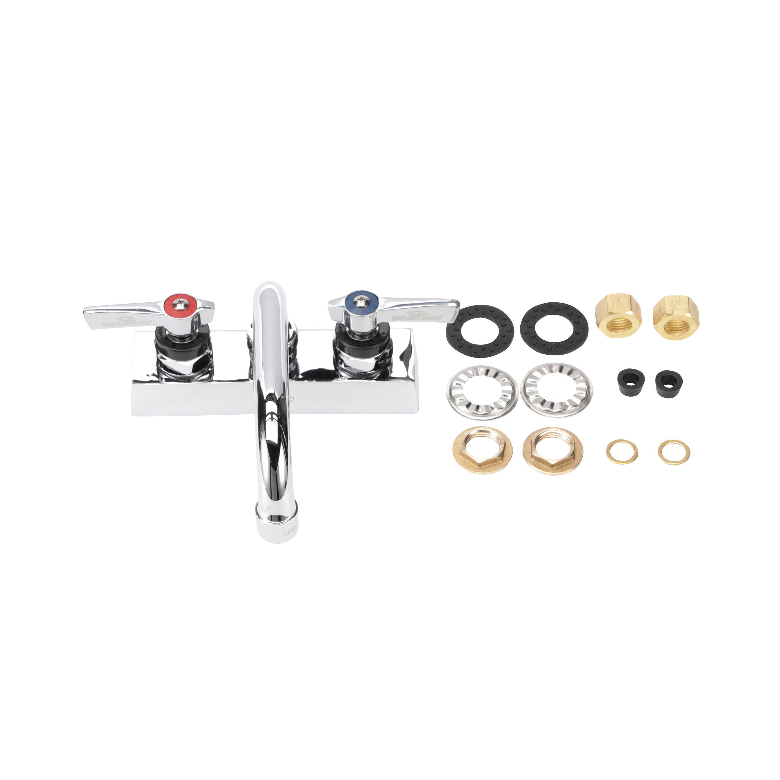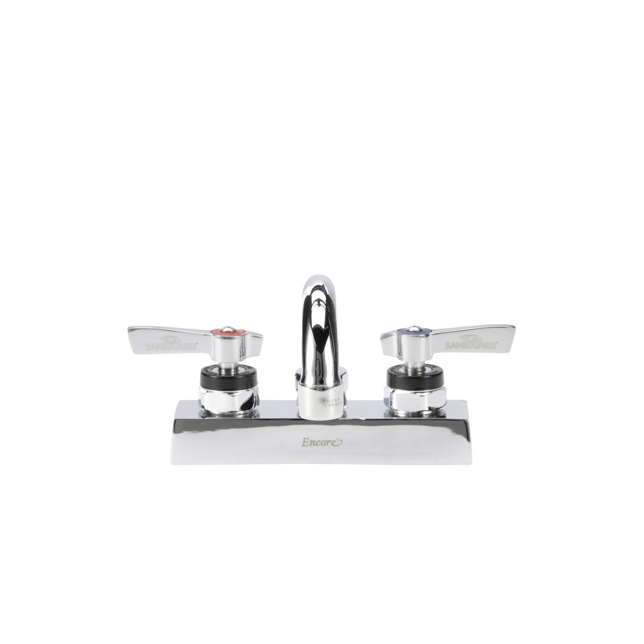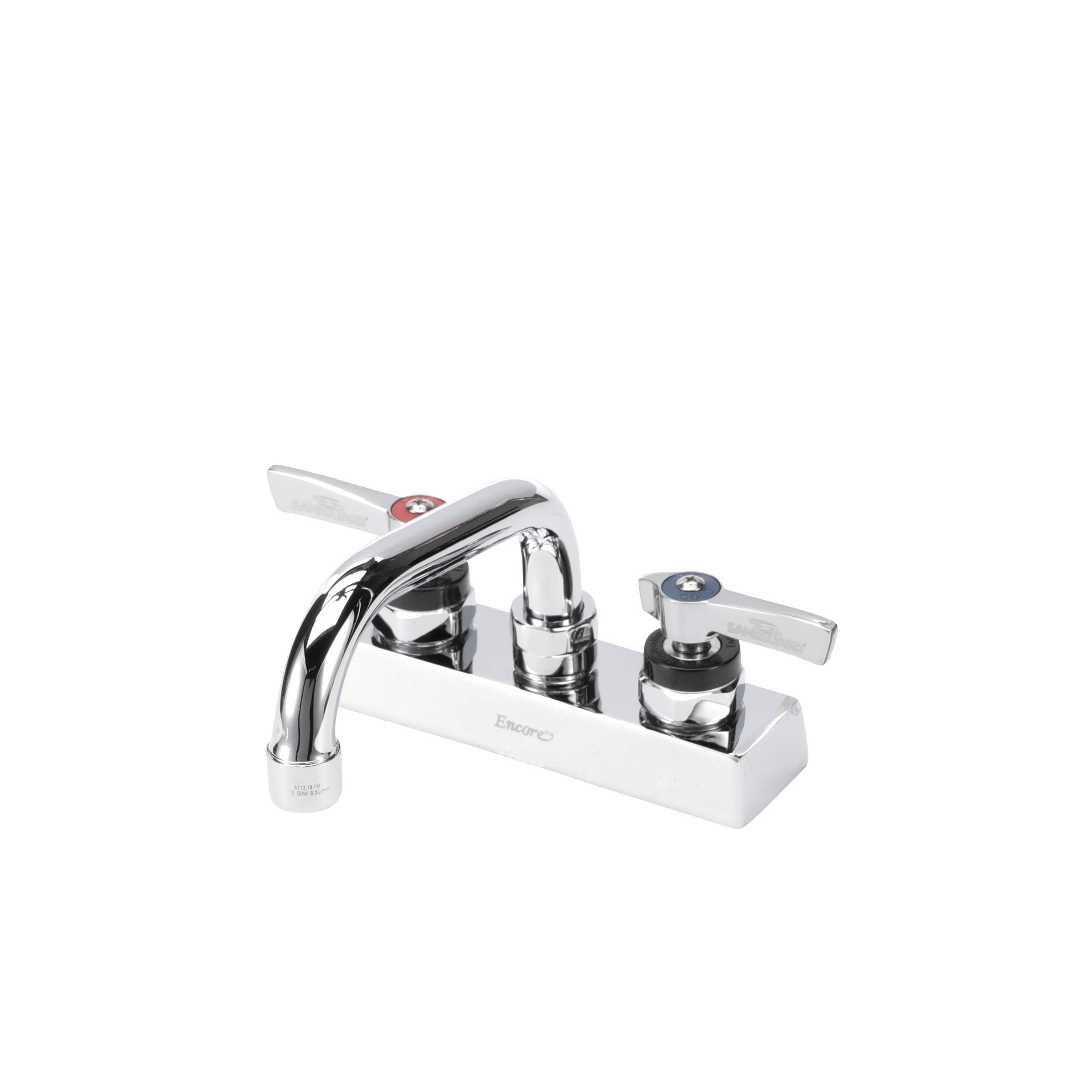 • Deck mount • 4" (102mm) O.C. inlets • 6" (152mm) stainless steel horizontal swing spout • 1/4-turn full volume ceramic valves • Lever handles • 2.2 gpm aerated stream aerator • Low lead compliant • NSF • Brand: Encore®