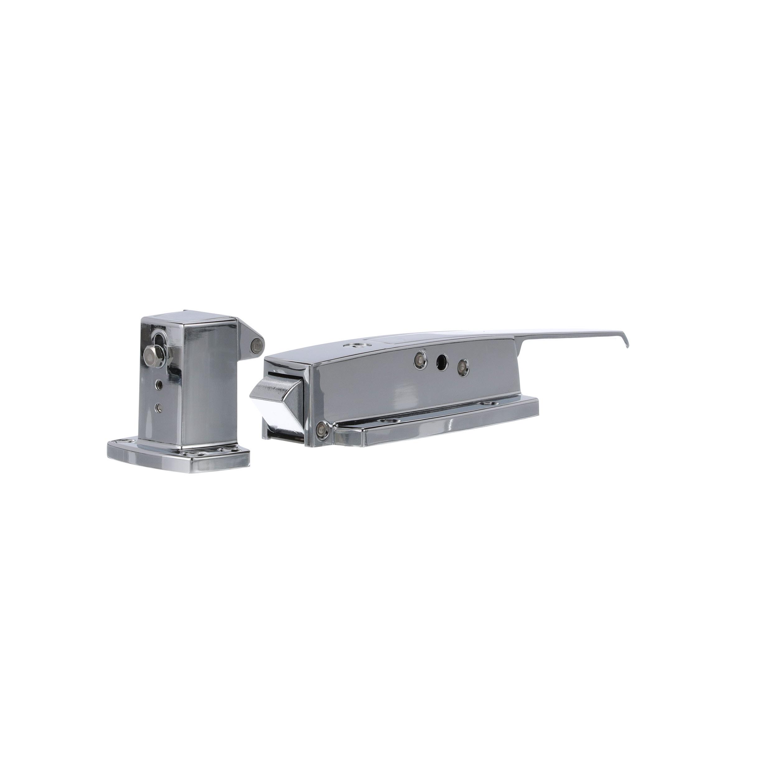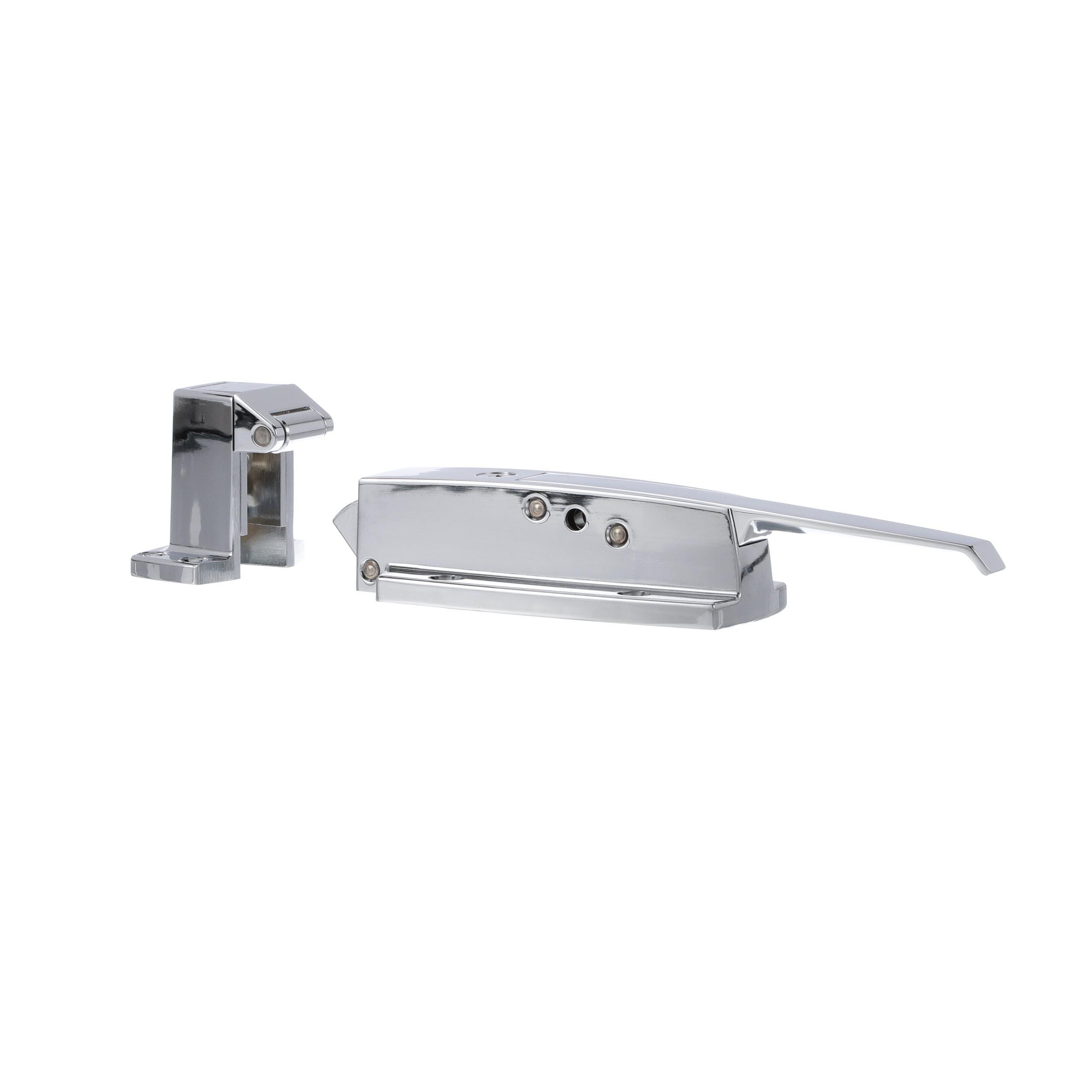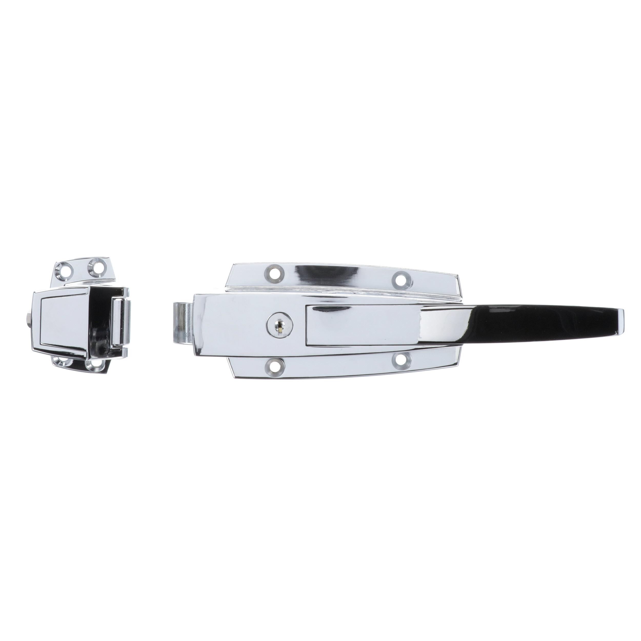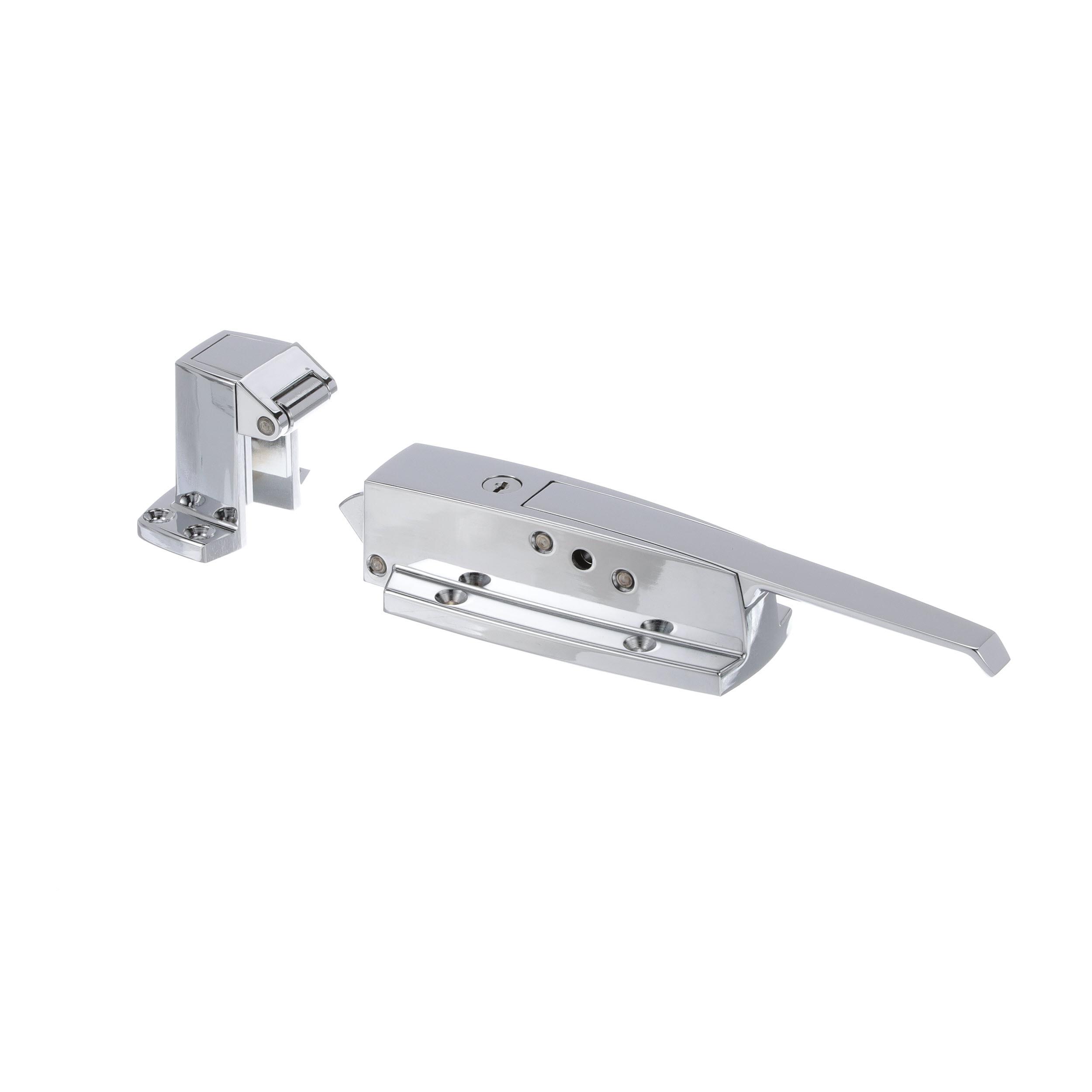 - 3/4 to 1-5/8" Offset Polished Chrome Heavy Duty Walk-In Cooler Door Safety Latch with Cylinder Lock and Strike