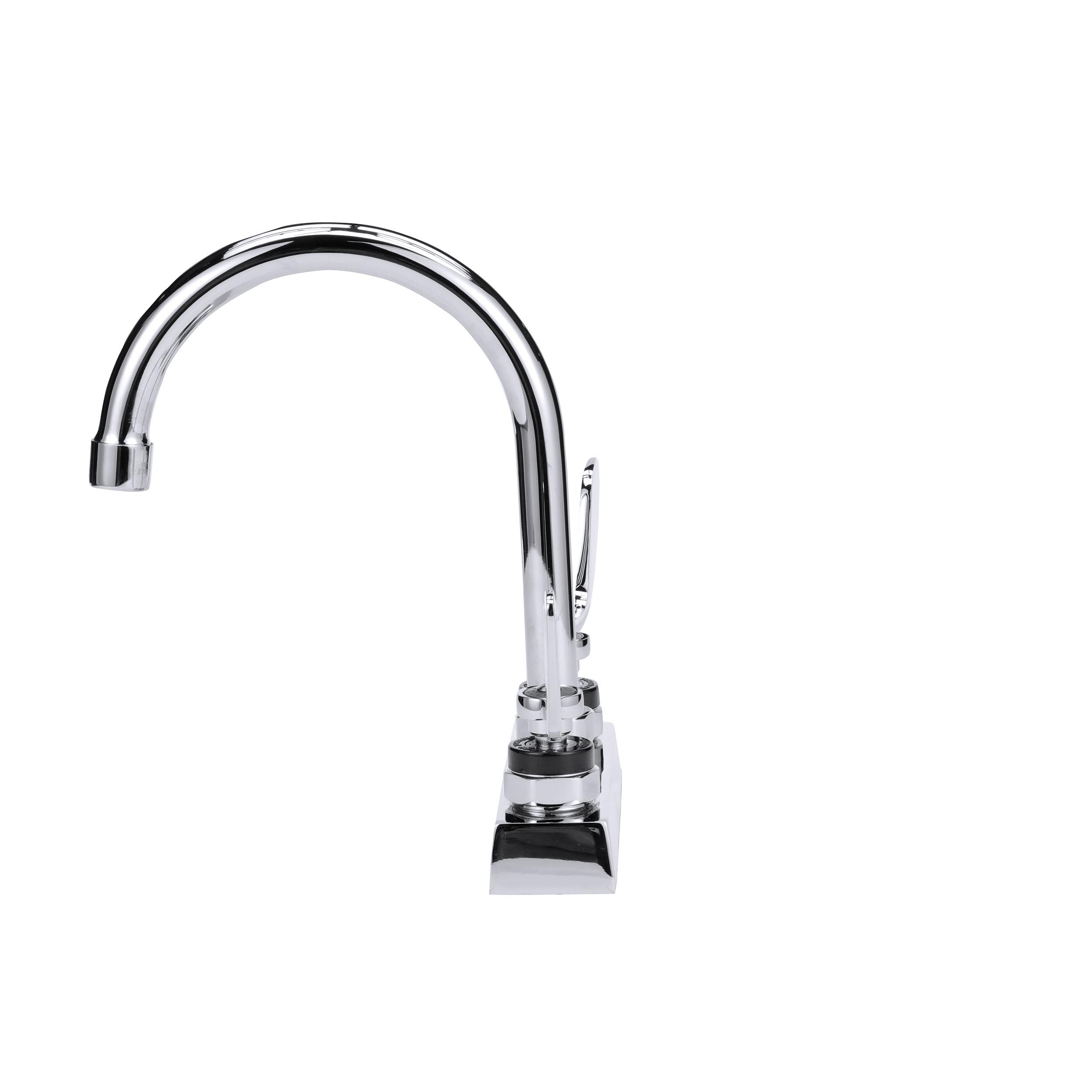 - Encore 4" OC Deck Mount Faucet Ceramic Valves with 6" Swivel Gooseneck Spout and 4" Wrist Blade Handles, retail Packaging