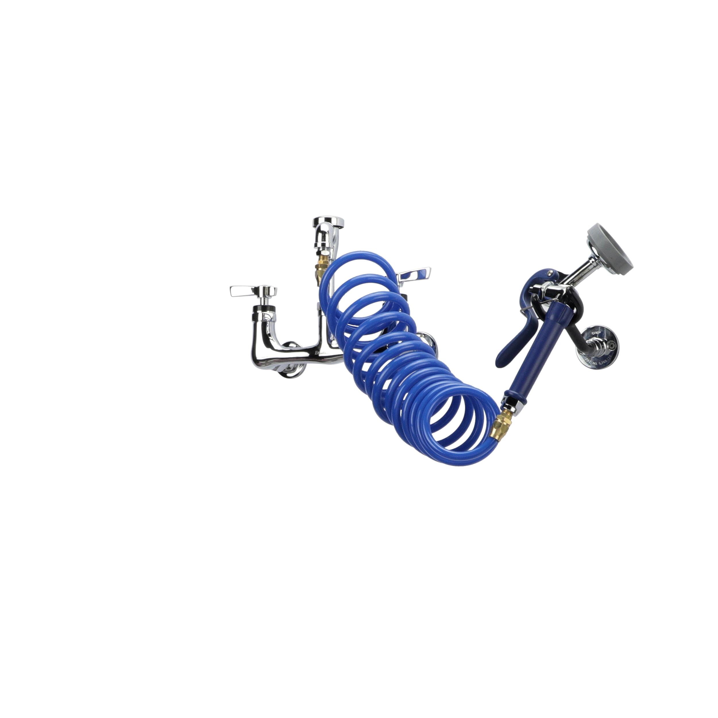 Encore 8" OC Wall Mount Veterinary Faucet with 108" Blue Coiled Hose, Vacuum Breaker and Lightweight Aluminum Side Sprayer
